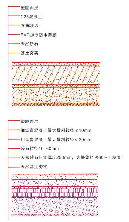 復(fù)合型塑膠跑道:底層用聚氨酯單組份膠水混合黑色橡膠粒攤鋪,施工方法同透氣型。面層用聚氨酯雙組份材料加入填充料現(xiàn)場(chǎng)澆注而成,施工方法同混合型。